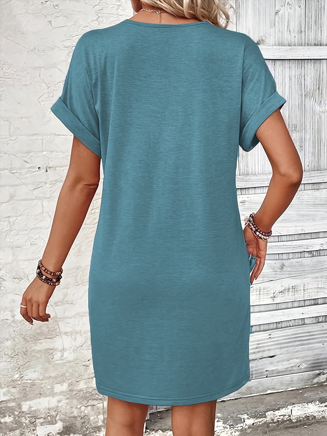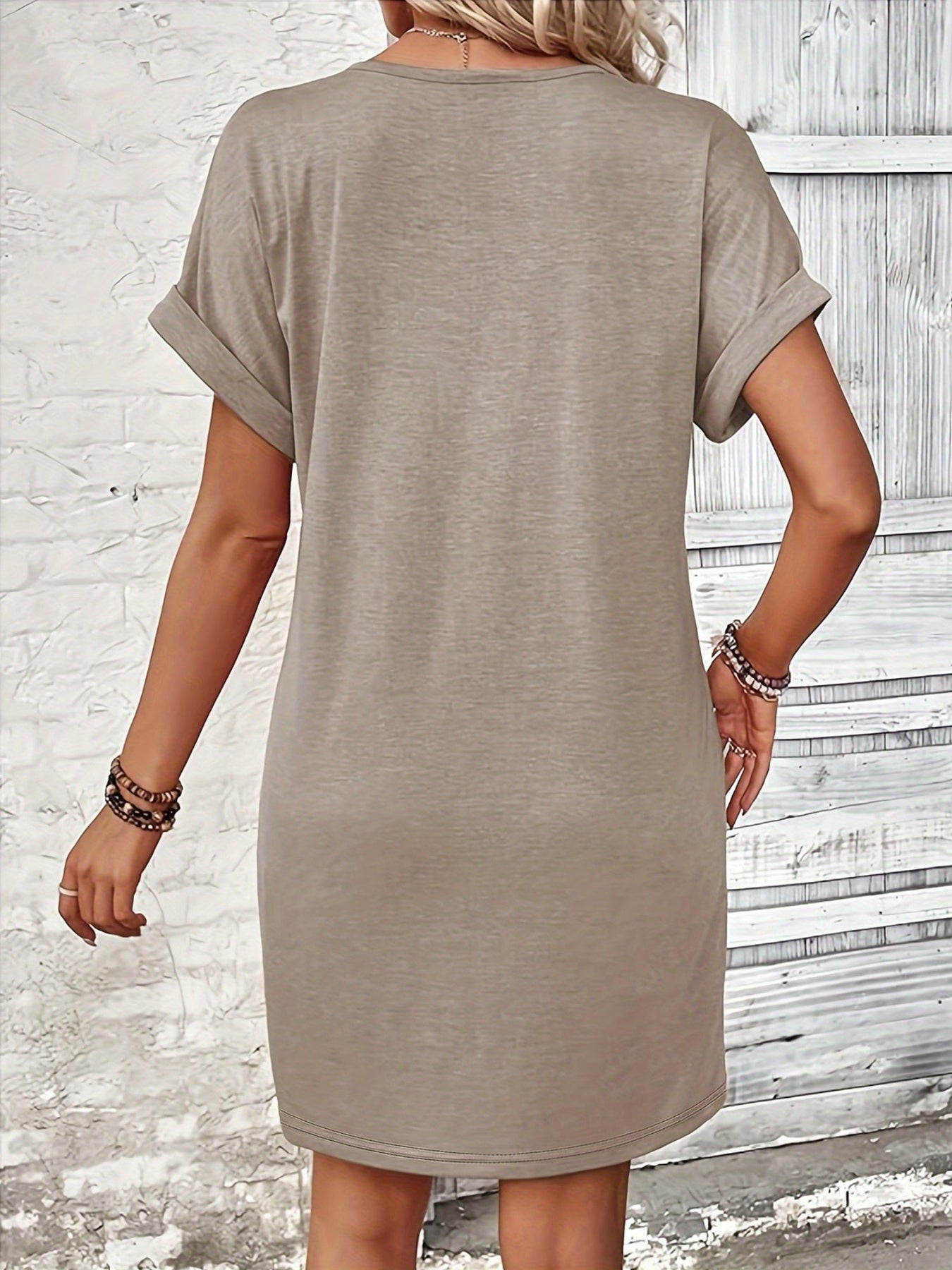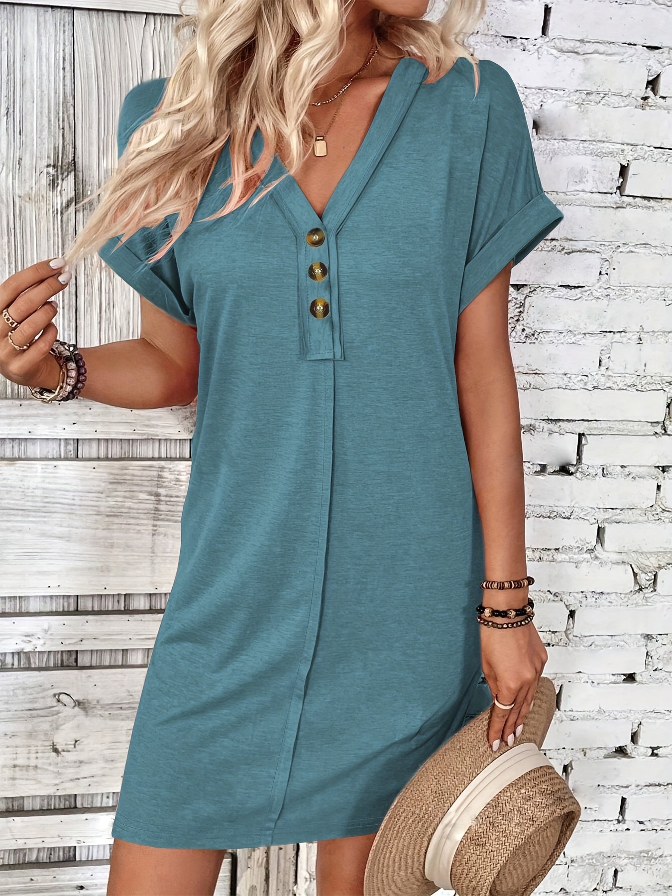 Denne stilfulde sorte kjole er din perfekte ledsager til forår, sommer og efterår. Med sin flatterende V-udskæring, fine knaplukning og afslappede korte ærmer udstråler den ubesværet elegance. Den lige pasform og lette fald giver maksimal komfort – uanset om du skal til stranden, en frokostaftale eller en aftenpromenade.