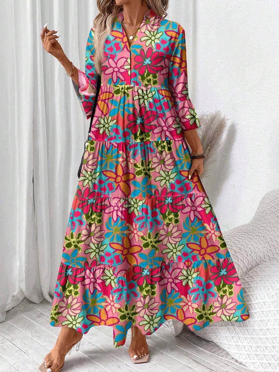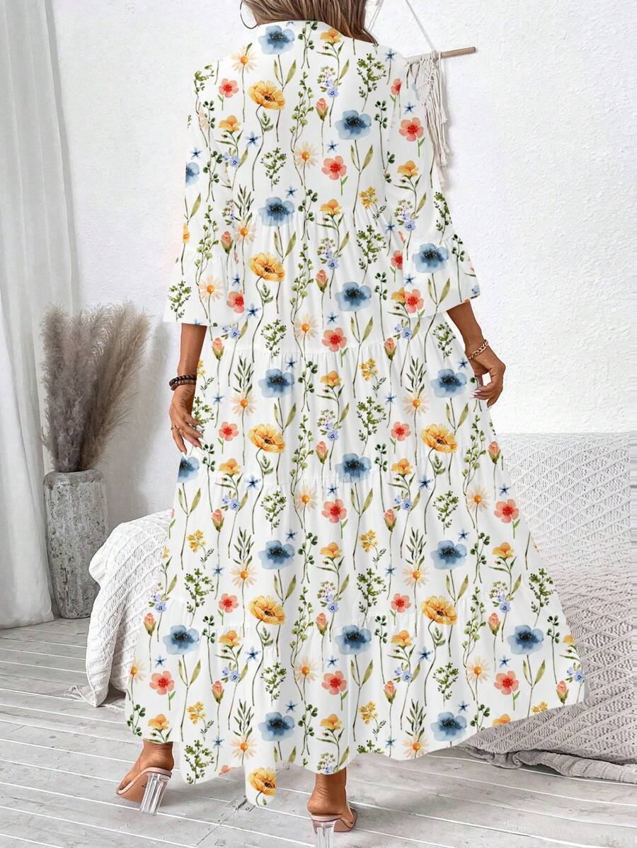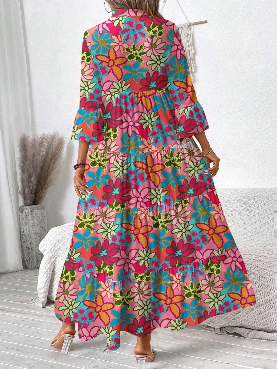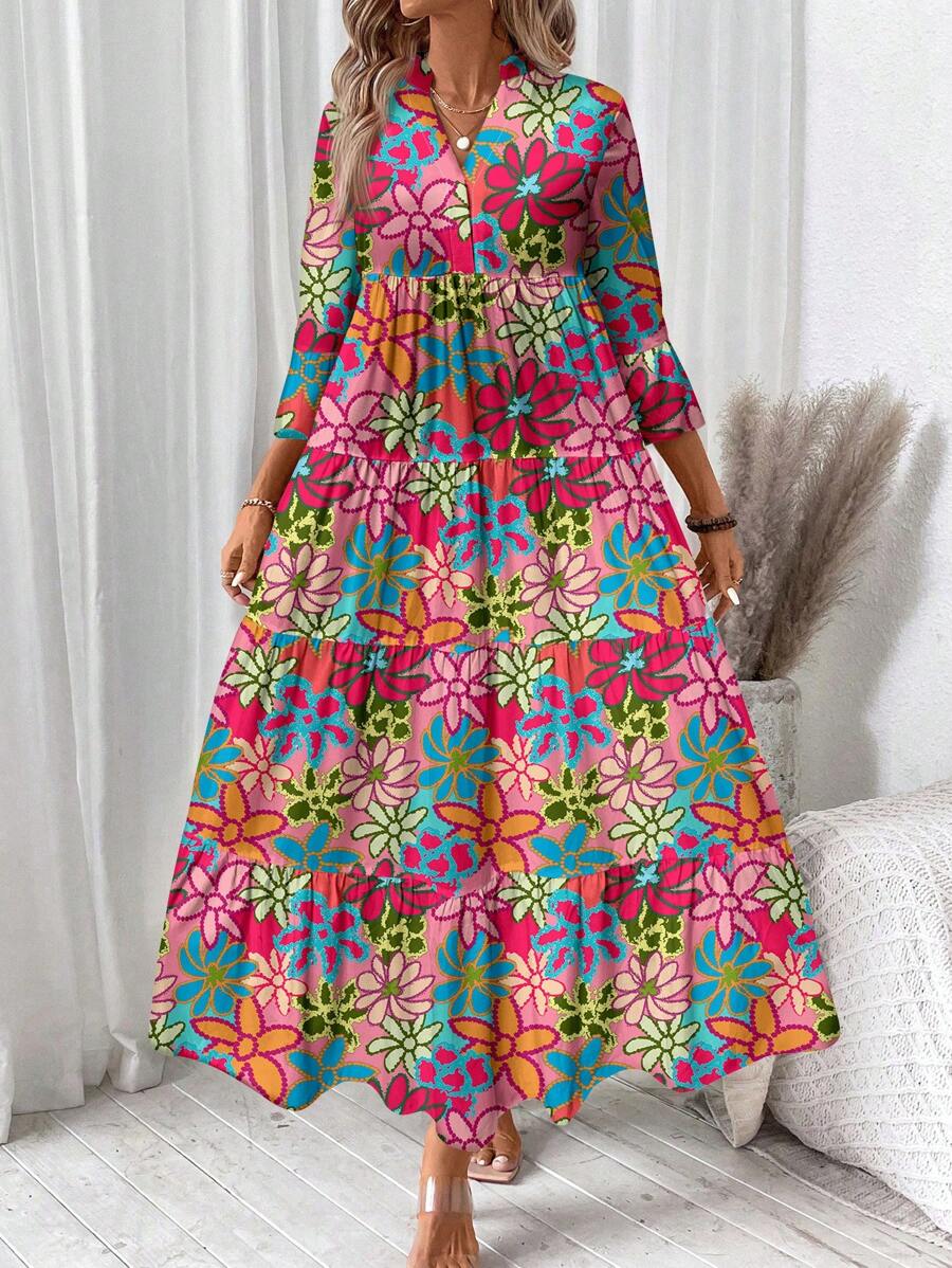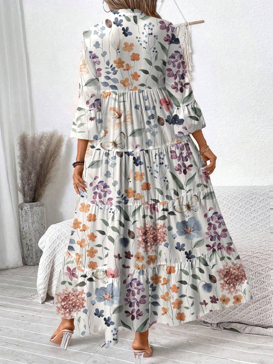 ✓ Smukke boho-detaljer – Med plisserede lag, revers-krave og farverigt planteprint er kjolen alt andet end kedelig