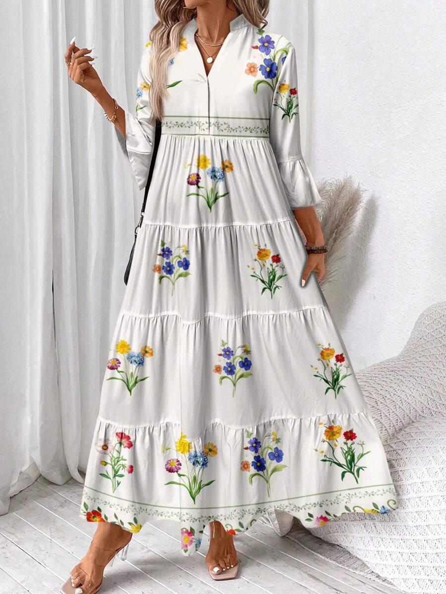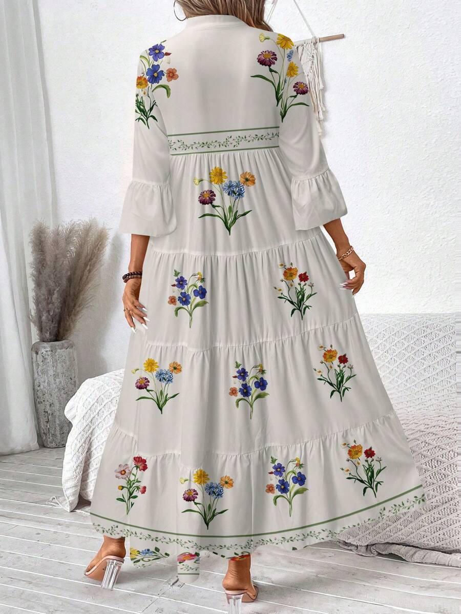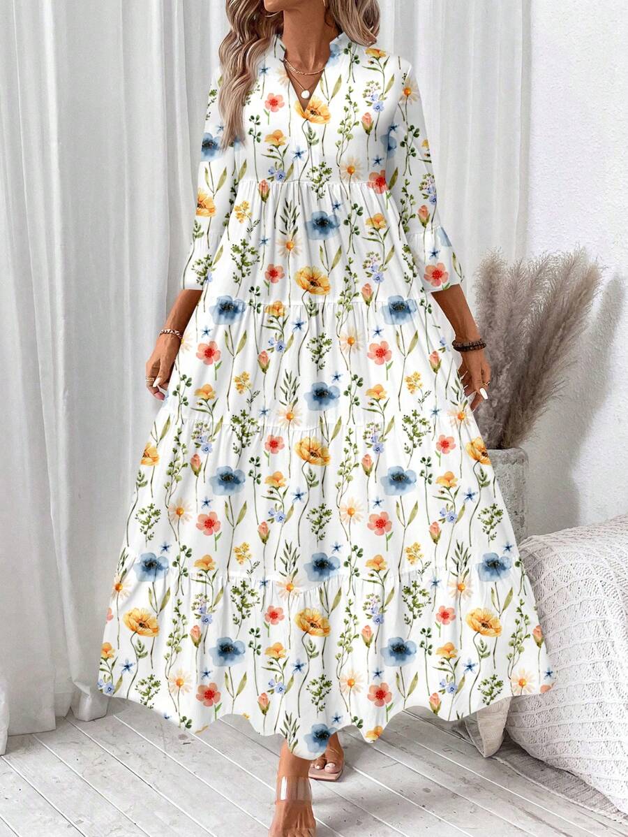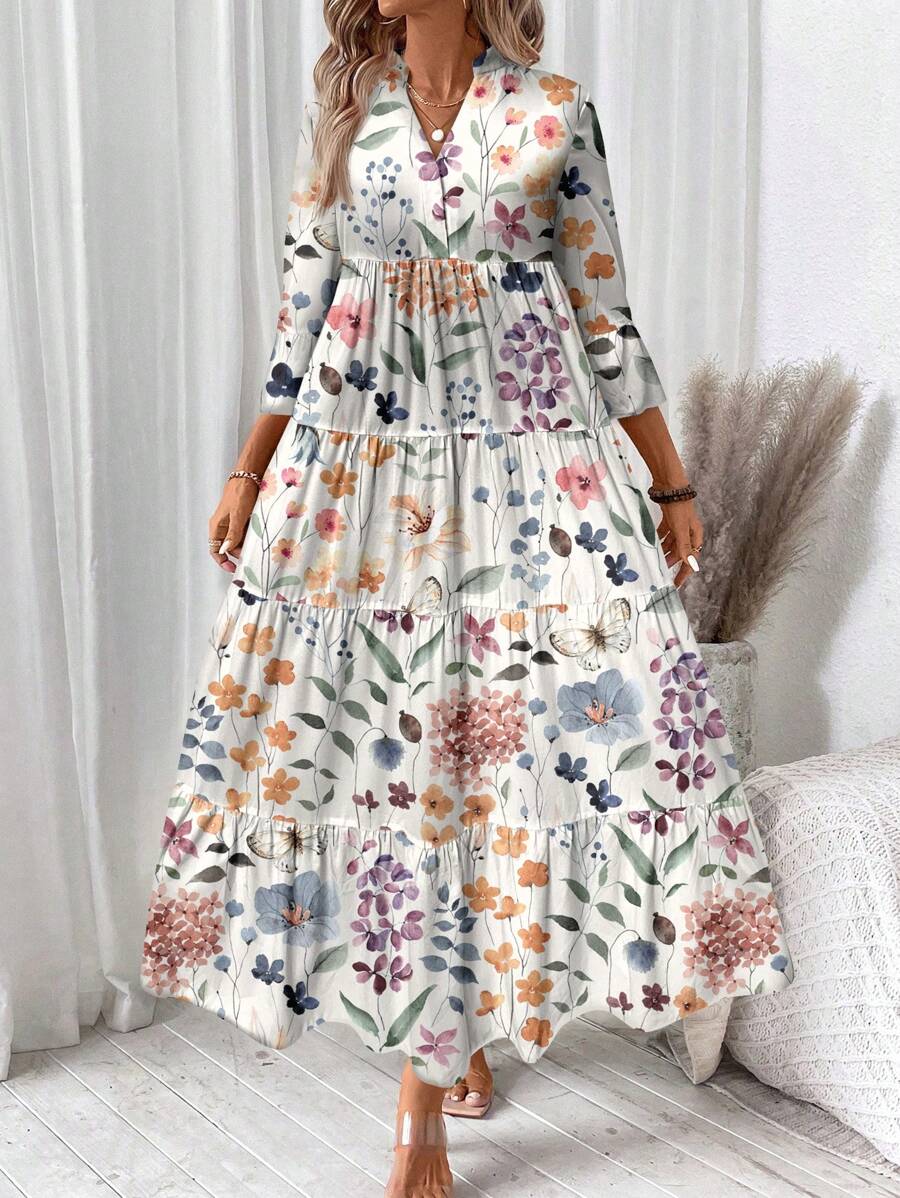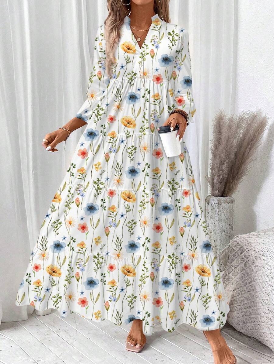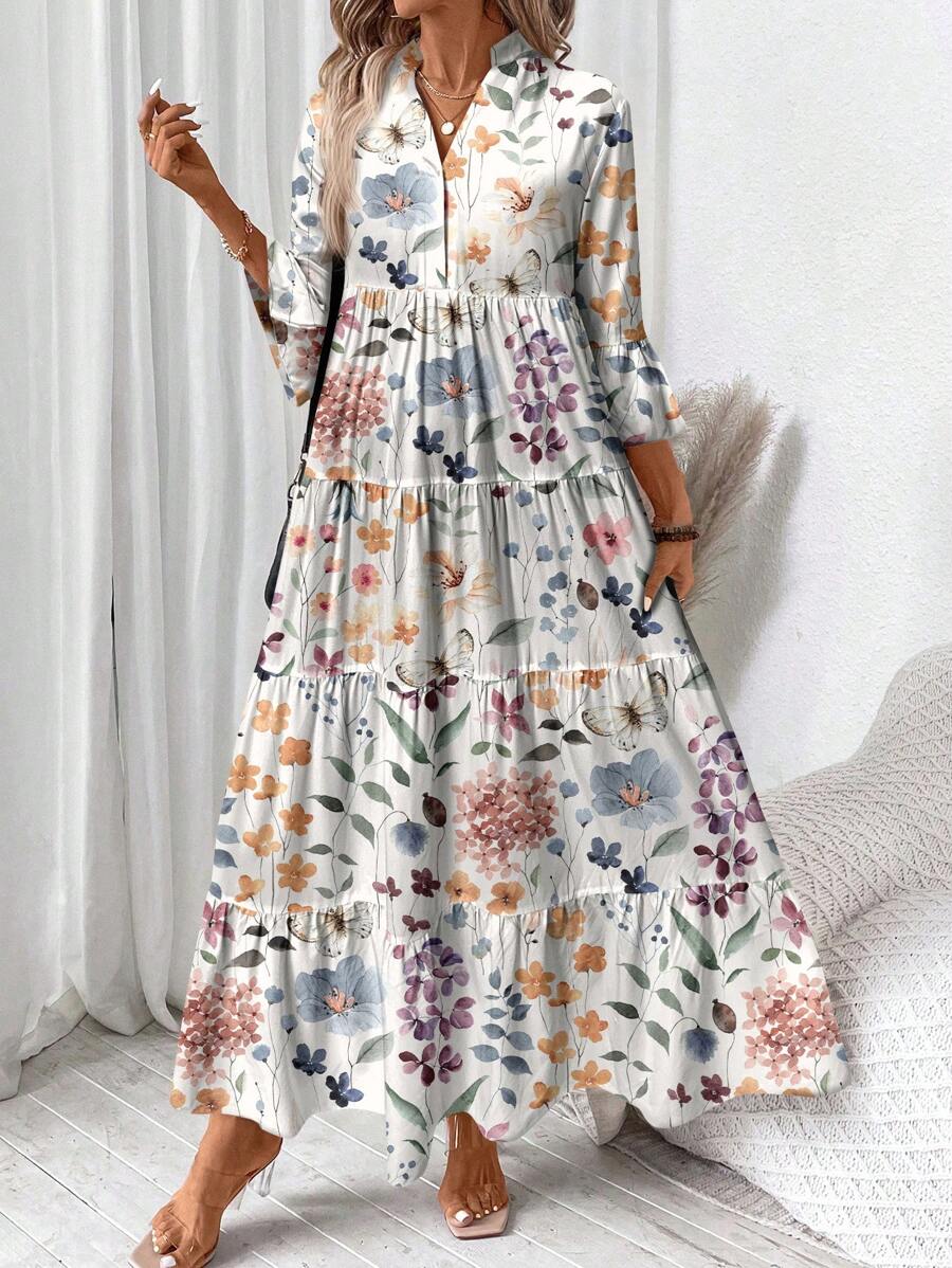 ✓ Smukke boho-detaljer – Med plisserede lag, revers-krave og farverigt planteprint er kjolen alt andet end kedelig
