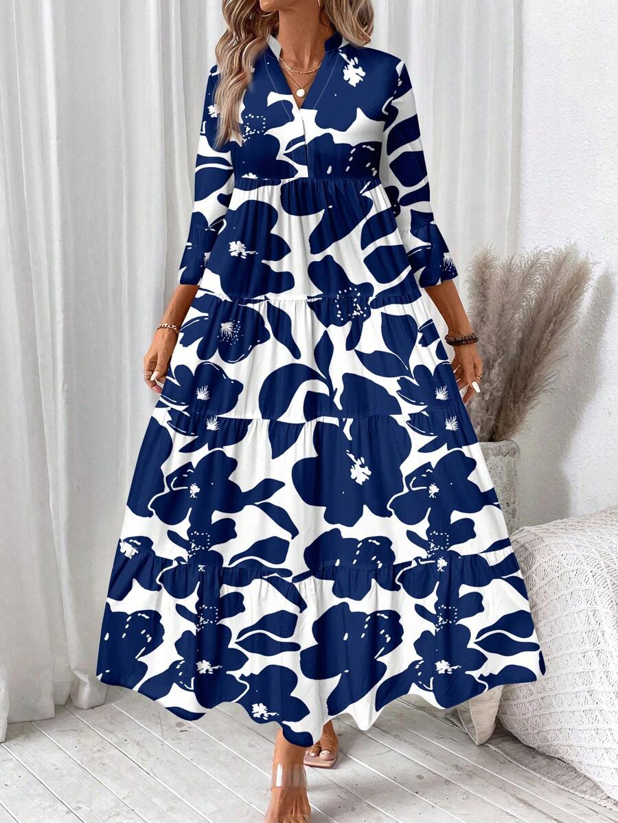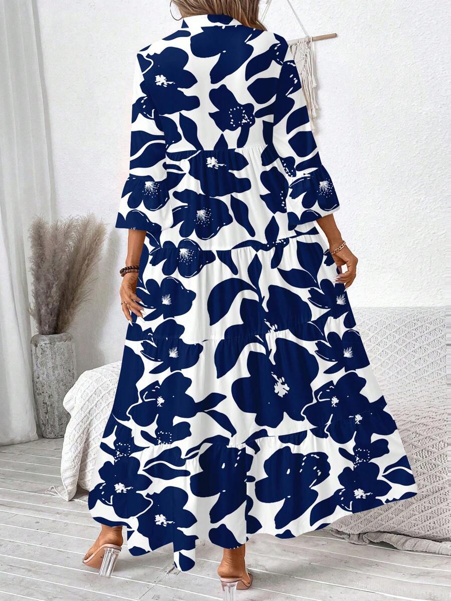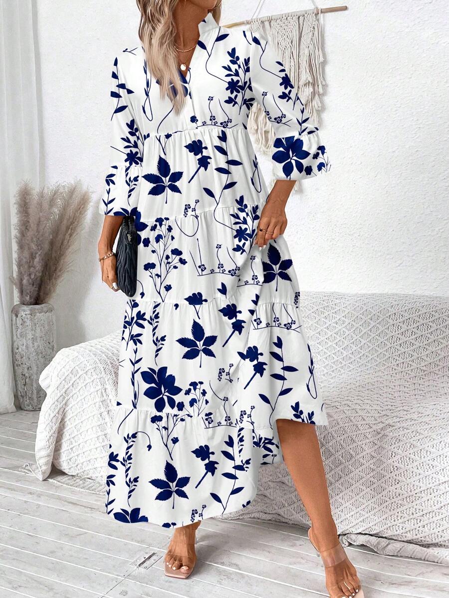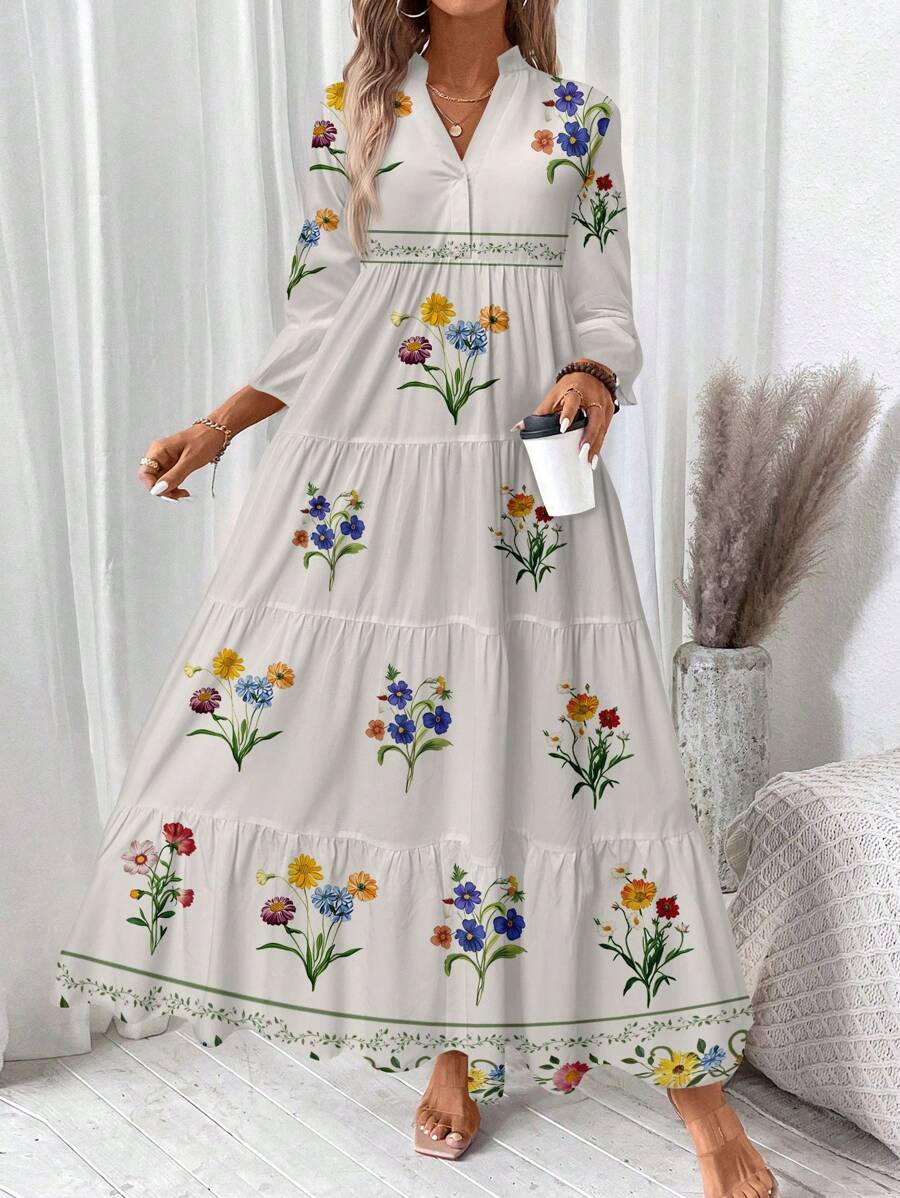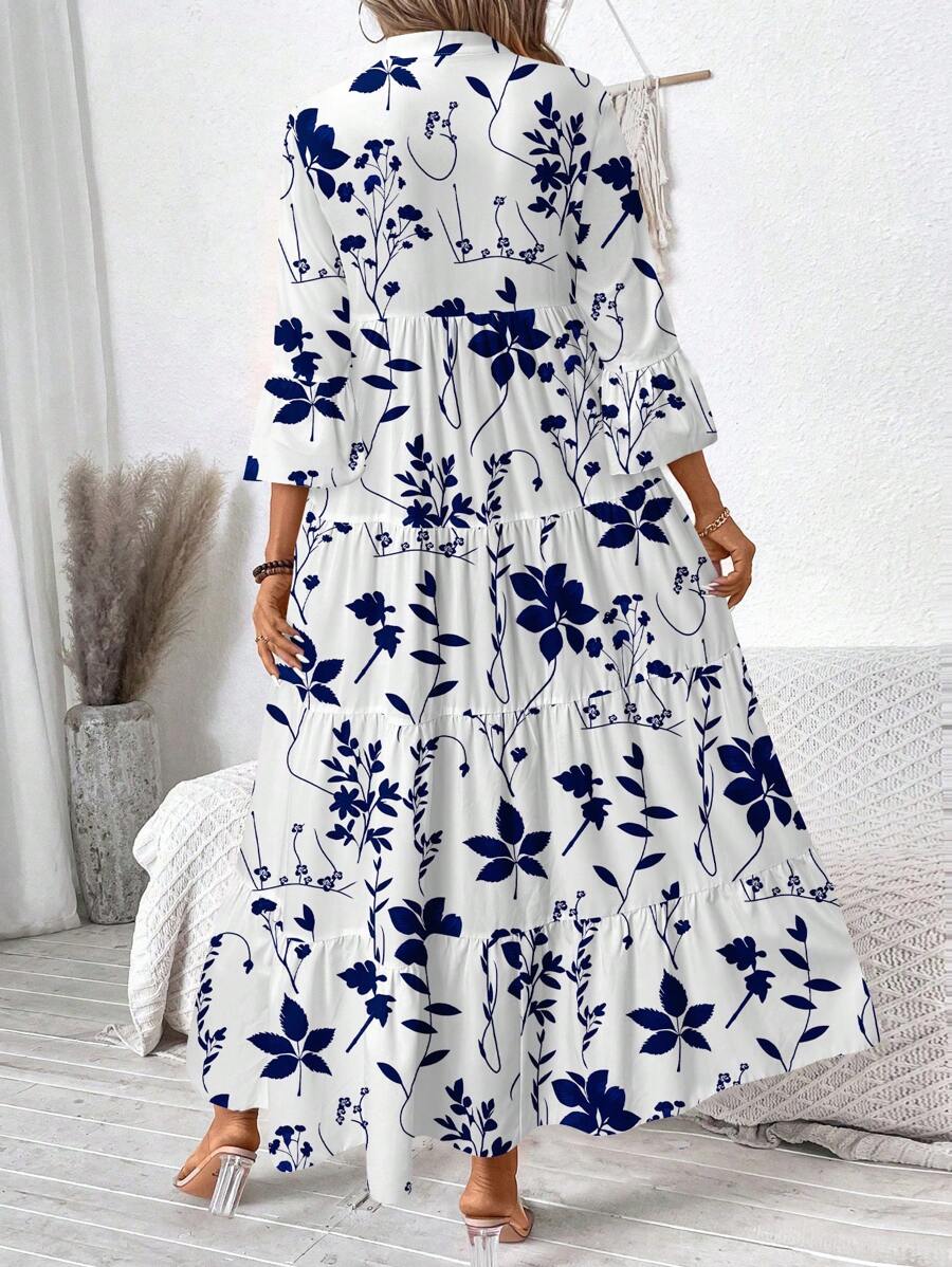 ✓ Smukke boho-detaljer – Med plisserede lag, revers-krave og farverigt planteprint er kjolen alt andet end kedelig