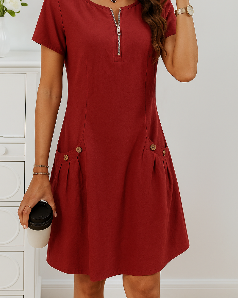 Stil uden besvær: Denne kjole med korte ærmer gør kompleks outfitplanlægning overflødig. Tag blot dine accessories – og du er klar. En “smid-på-og-gå”-kjole, der stadig får dig til at se stilfuld og velklædt ud uden anstrengelse.