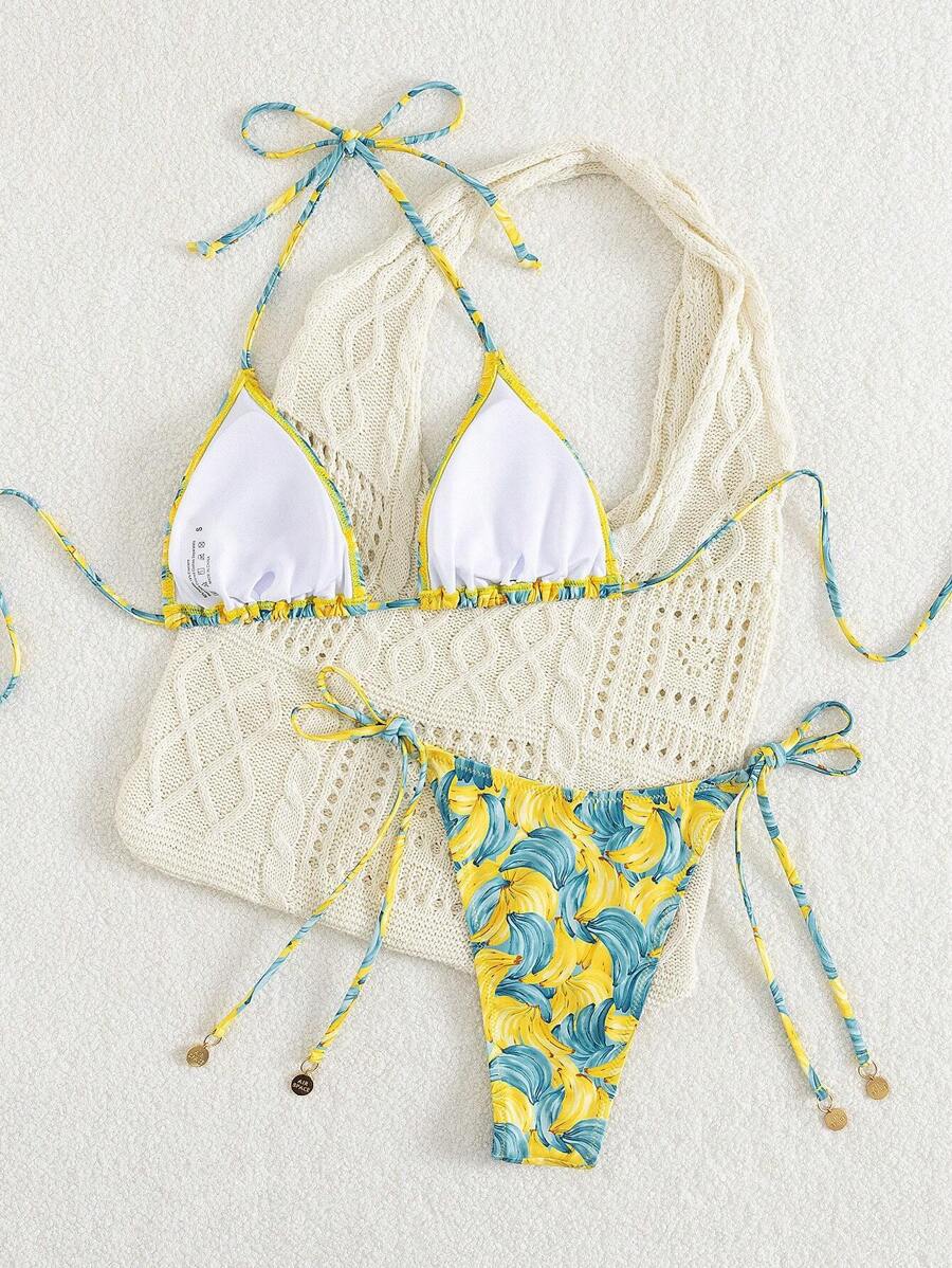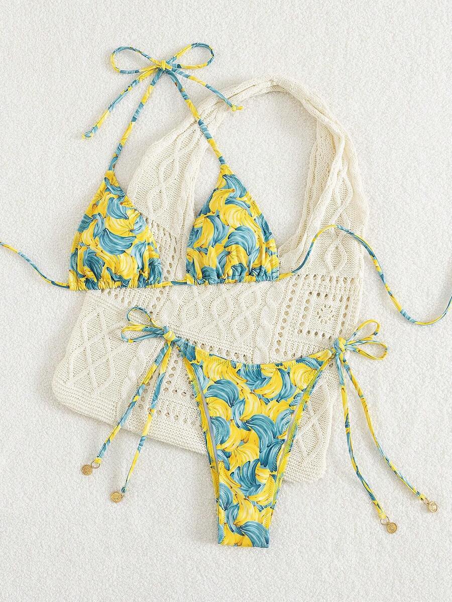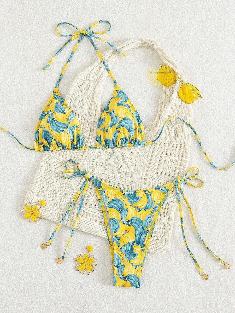 ✓ Farverigt og friskt design – Et legende frugt- og grøntmønster kombineret med en sexet halterneck og trekantskopper for en iøjnefaldende, sommerlig stil